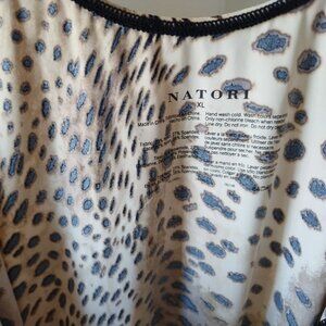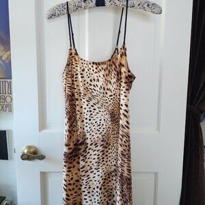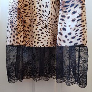 EUC size XL Natori leopard print stretch slip with 6" black infinity lace around the bottom hem. Elasticized straps are adjustable and the leopard fabric itself is more like a slinky shapewear fabric than slippery nylon satin. Designed to skim the body but not cling - this could be worn as both a slip and a nightgown. NOTE: This style ran small and recommendations were to size up one or two sizes depending on how you wanted it to fit. If you normally wear a size medium or large, this XL should fit you just right!