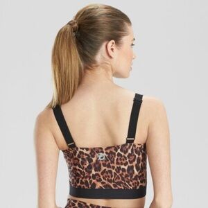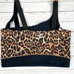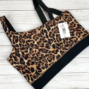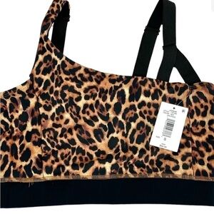 Stylish leopard print bra. Features bold black straps. Comfortable and chic.