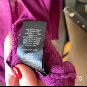 Purple knit (45% Acrylic, 45% Nylon, 10% Wool). Cardigan. Long sleeves. Pockets. 31" from shoulder to hemline. Imported.