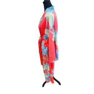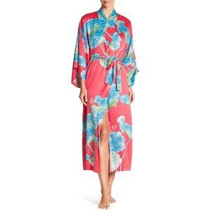 Natori Private Luxuries Floral Kimono Robe Belted Tie Vibrant Red Blue M Resort