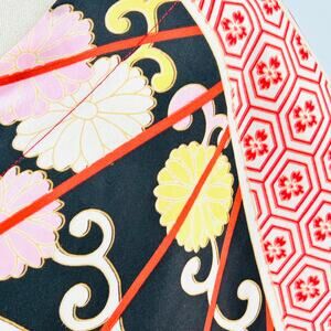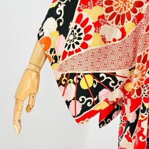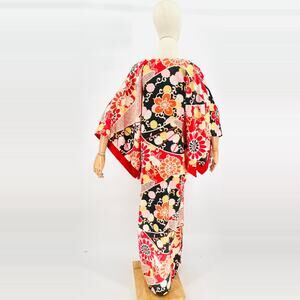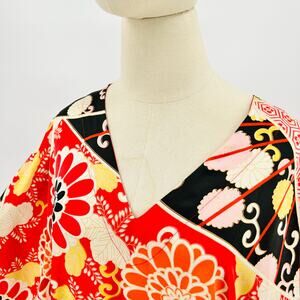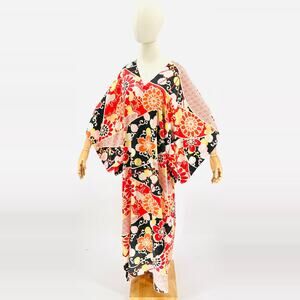 This stunning kaftan features bold Japanese-inspired floral motifs and geometric hexagon patterns in a vibrant red, black, yellow, and pink palette with wide sleeves.