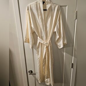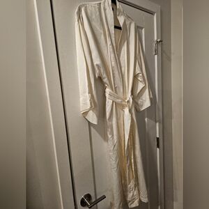 Elegant cream color robe by Natori. 100 % polyester so Soft and luxurious fabric. Matching tie belt will fit size Large too.Perfect for lounging. maybe wore 1 time for an hour..