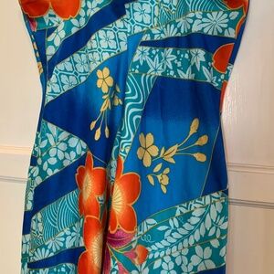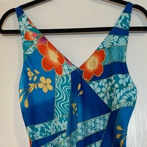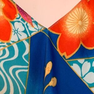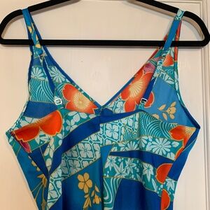 Blue and orange satin slip dress by Natori. Bust 34", waist 32", from shoulder to hem 48". Has some stretch. Adjustable straps. In good condition.