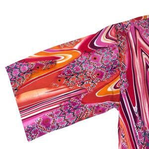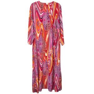 Natori Satin V-Neck Caftan Long Gown Loungewear Pink Orange Abstract Sz Medium