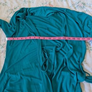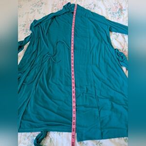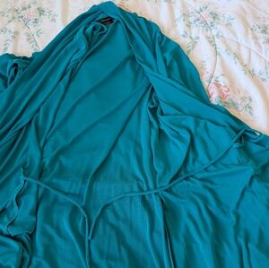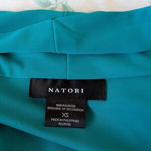 I think this soft slinky robe is an older version of the Natori Aphrodite Short Wrap. This version is 100% polyester. Amazingly drapey! Removable belt and internal tie. Worn once or twice and I never reach for it so needs a new home. Due to the nature of the material, there are scattered pills and faint white spots at the wearer's back and shoulders. Not visible unless you get really close to the fabric. Does not affect fit and function.