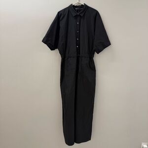 Black (50% Cotton, 50% Nylon). Jumpsuit. Three-quarter sleeves. Collared neckline. Front button closure. 25" from shoulder to hemline. 25" inseam. 13.5" rise.