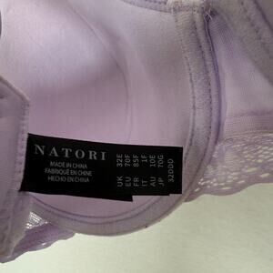 Natori underwire bra in size 32DDD, purple color with lace panel detailing. Lightly lined cups, T-shirt contour shape. Adjustable straps, back hook-and-eye closure. Excellent condition with tag attached. Style A10165.
