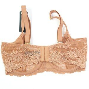 This is a brand new with tags Natori Women's Heavenly Convertible Balconette Underwire Bra. This bra features a beautiful, very soft stretch lace fabric in a tan color with scalloped edging. It has an everyday balconette underwire, convertible straps that can be worn conventional or criss-cross, 4-row stretch hook and eye closure, finished with gold hardware.