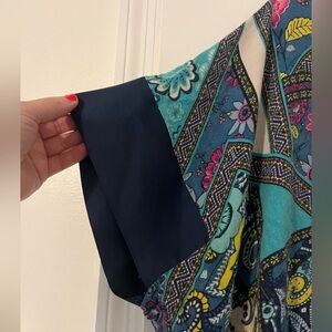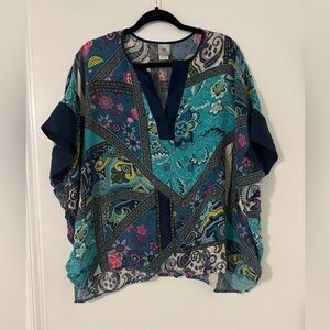 This Natori blouse showcases a vibrant graphic design in green and blue hues, offering a relaxed and boxy fit. The intricate paisley and floral patterns add an artistic touch, making it a standout piece for any casual occasion.