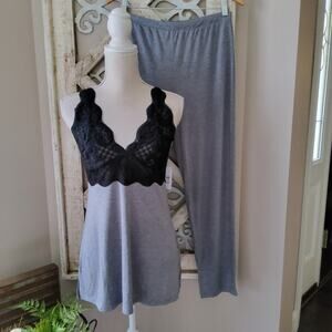 Black and gray obsession pajama set with pull-on elastic waist pants and lace cami by Natori.