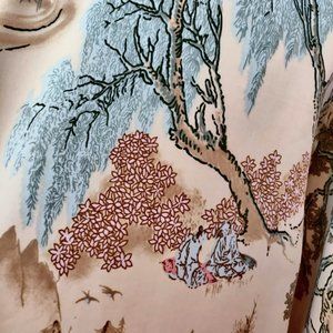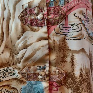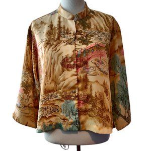 Good condition, minor signs of wear, no rips, holes or tears, gently used, very pretty allover asian print, 3 buttons, mandarin collar, kimono sleeves, short length