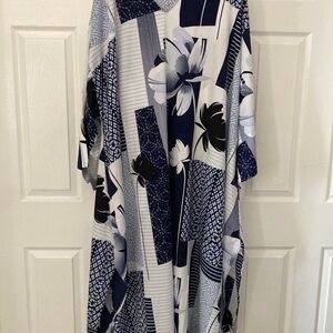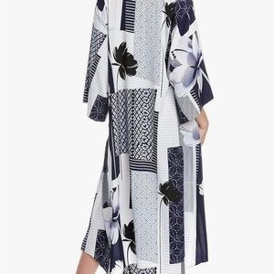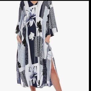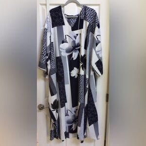 printed satin caftan, floral/geo printed, 3/4 length sleeves, v-neckline, slits on sides