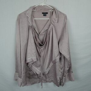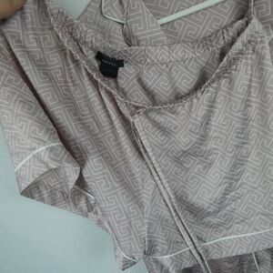 Blush/mauve pink with white labyrinth print and white piping. Button down front on long sleeve top and string ties at the shorts waist. Size large.