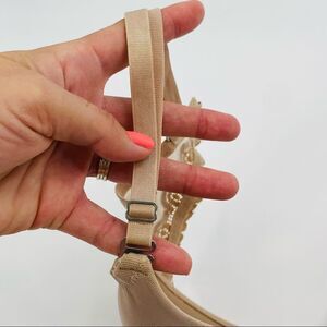 Natori beige lightly lined tee shirt bra size 32DD. Gently used condition see photos for detail. The adjustable straps have very mild discoloration from oxidation of the gold toned hardware.