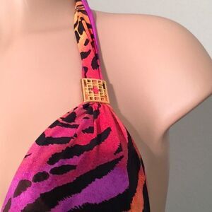 Beautiful colored tiger print. Quality crafted with gold accents, formed cups, and tie strings. #004229