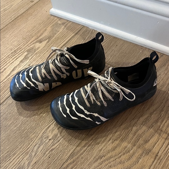 Step up your game with these stylish black and white iron lion barefoot cleats by Natur . Perfect for any casual outing or workout session. See size chart. These are size 4.