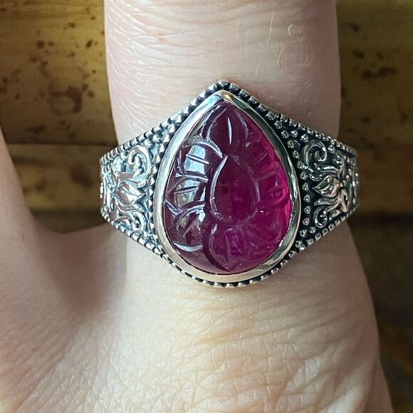 This beautiful solitaire ring features a genuine, earth mined ruby from Africa. The stone has a carved flower design on it and measures 14x10mm. The ring is set in solid .925 sterling silver, making it perfect for everyday wear. The ring in the photos is the actual one you will receive, so please see photos for gemstone quality and measurements. Size 8.