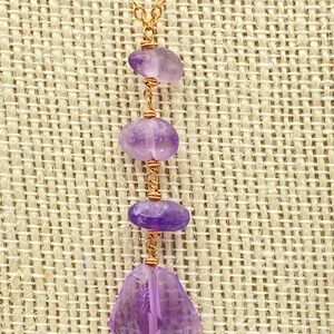 Natural Amethyst Gold Filled Chain Drop Necklace 15"-18". Chain is marked Gold Filled on lobster clasp. Measures 15" + 3" extender chain with 2" drop. Minimalist necklace is in very good condition and possibly only gently worn, if at all. #41-B