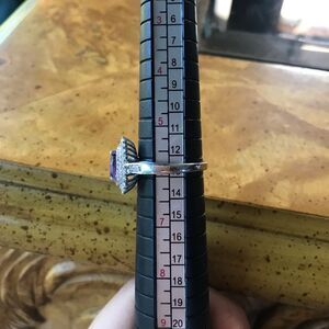 This pretty ring is made with a premium amethyst mined from Uruguay. The clear stones creating the double halo are genuine white zircons The metal is solid .925 sterling silver, and it also has a platinum plate to prevent tarnishing. Size 6. New (worn for photos only).
