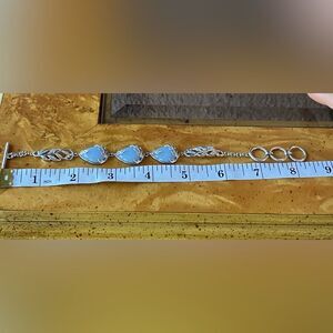This pretty bracelet is made with completely natural, earth mined Angelite from Mexico. The bracelet is set in solid .925 sterling silver with a rhodium plate to prevent tarnishing. The bracelet has an adjustable toggle closure and will fit a 7 inch to an 8 inch wrist. The total bracelet length is about 8.25 inches. The bracelet in the photos is the actual one you will receive, so please see photos for gemstone quality and measurements.