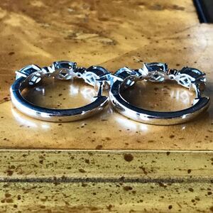 These stunning earrings feature 2.91 ctw of genuine, earth mined aquamarine (heated). The stones measure about 6x4 mm. The earrings additionally have earth mined blue sapphires (heated). The earrings are set in solid .925 sterling silver with a tarnish resistant rhodium finish. The earrings in the photos are the actual ones you will receive, so please see photos for gemstone quality and measurements.