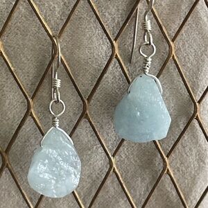 These delicate handmade earrings showcase raw aquamarine stones, wire-wrapped in genuine sterling silver. With their soft, seafoam blue hue and organic shape, these earrings radiate calm and elegance. Lightweight and eye-catching—perfect for everyday wear or as a unique gift.