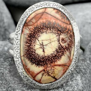 Wonderful New Birds Eye Jasper Ring set in solid 925 Sterling Silver. This Jasper is a form of Rhyolite. It's appearance can be quite varied, which is what makes it so unique & appealing to most jewelry collectors. The Mexican Birds Eye Jasper is given its name from the range of Southwestern colors that can make up the bands & varied swirls in the stone. This stone is very popular among those who want a unique piece of jewelry. Thought of as a stone of general healing.