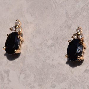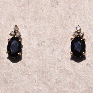 The 196th Street: Natural Black Sapphire and Diamond Stud Earrings. The earrings feature an oval brilliant cut natural black sapphire below a series of three round brilliant cut natural diamonds above. The earrings are crafted in 14 karat yellow gold and finished with posts and push style backings.