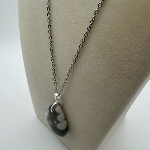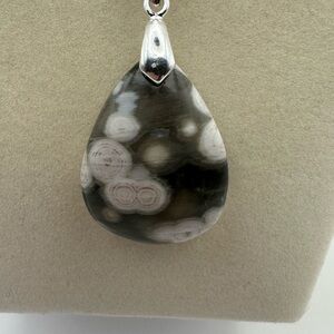 This elegant necklace features a striking natural black and grey ocean jasper pendant. The back side has a natural druzy. The bail is Sterling Silver (S925) and it comes on an 18” silver color stainless steel box chain. Pendant is approximately 1.5”.