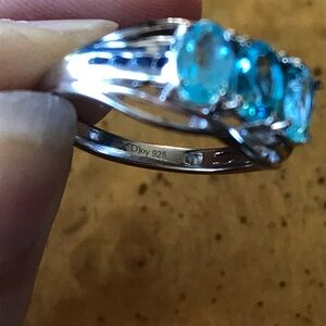 This pretty ring features all genuine earth mined gemstones. The three, vibrant blue gemstones are blue apatite. These stones measure 6x4 mm. The ring additionally has dark blue sapphire accents. The ring is set in solid .925 sterling silver with a rhodium finish. The ring in the photos is the one you will receive, so please see photos for quality and measurements. Size 6.
