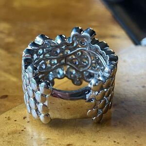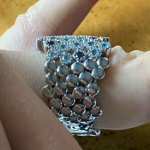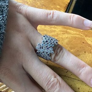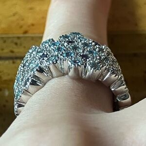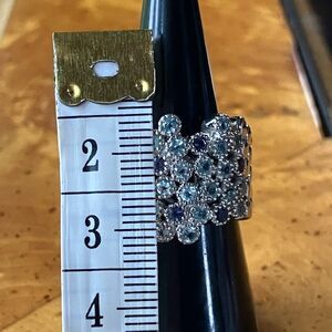 This beautiful ring features all genuine, earth mined gemstones. The light blue stones are apatite (heated), and the violet blue stones are iolite. The stones measure 2 mm each, and the ring has a total gemstone carat weight of 2.00. The ring additionally is set in solid .925 sterling silver with a rhodium plate to prevent tarnishing. This ring has a nice weight to it and also has a low profile, making it perfect for regular wear. The ring in the photos is the actual one you will receive, so please see photos for quality and measurements. Size 7.