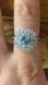 This ring is stunning. It is made with genuine, earth mined blue zircon from Cambodia. The stone measures 6mm. The clear stones surrounding the blue zircon are natural, earth mined white zircons. The total carat weight on the ring is 2.35. The ring is set in solid .925 sterling silver with a rhodium plate to prevent tarnishing. The ring in the photo is the one you will receive, so please see photos for gemstone quality and measurements. Size 8.