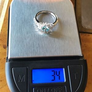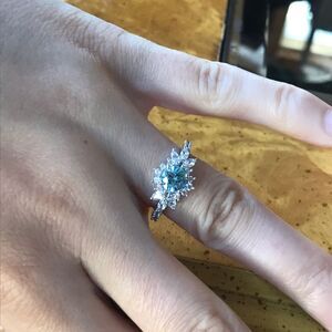 This ring is stunning. It is made with genuine, earth mined blue zircon from Cambodia. The stone measures 6mm. The clear stones are natural, earth mined white zircons. The total carat weight on the ring is 2.25. The ring is set in solid .925 sterling silver with a rhodium finish. The ring in the photo is the one you will receive, so please see photos for gemstone quality and measurements. New, worn for photos only. Size 6.