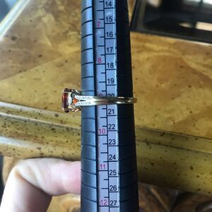 This stunning ring is made with all genuine, earth mined stones. The main stone is a cherry citrine mined from Brazil. The coloring is a vibrant orange/red, similar to a fire opal. The clear accent stones are white zircons. The ring is set in solid .925 sterling silver with a yellow gold vermeil. The ring in the photos is the one you will receive, so please see photos for quality and measurements. Size 9.