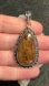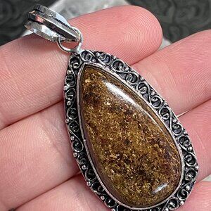 Pendant of an oval shaped natural bronzite crystal stone in a vintage styled swirl patterned silver plated setting.