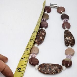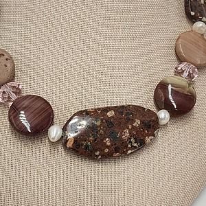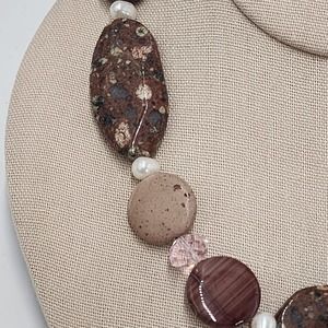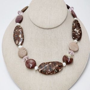 Natural Brown Rhyolite Agate And Genuine Pearl Chunky Statement Necklace 16"