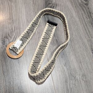 Natural Chevron Wide Wooden Buckle Belt, no flaws and great natural and black colors. This is braided straw and crotched materials.