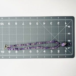 Vintage chip bead amethyst necklace with amethyst drop. It measures 15.5 long laid flat. Fastened aprox. 7.5" plus 1.25" drop pendant. It has silver tone spacer beads and toggle closure.
