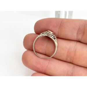 STUNNING red coral cabochon ring. Stone is oval cut and is bezel set. Stone is surrouned by a rope accent with beautiful cutouts and hand carved milgrain. Shank is open and straight toward the second. Marked with 925 on the inner shnak, tested positive for sterling when checked.