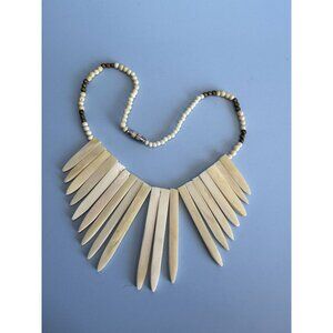 This handcrafted necklace combines natural bone and beadwork, offering a striking tribal-inspired design. Its pointed pendants create a bold yet elegant statement.