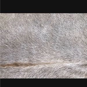 Natural cow hide with mix of gray, beige, silver. Nicely finished on underside. Comes with no-slip mat cut to match size. Yerra brand. Purchases from ABC Carpet and Home, a high end home decor store. No stains, tears. Excellent condition. Just didn’t work for our room. From non-smoking home.