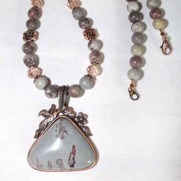 Materials: 1-3/4" antique cooper jasper pendant; 8 mm round crazy horse jasper beads; crystal beads; cooper findings.