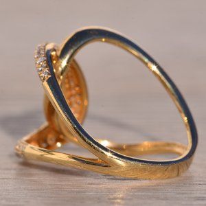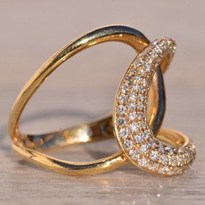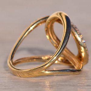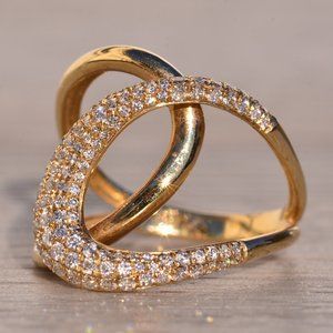 The 188th Avenue: Natural Diamond Cross Over Ring in Yellow Gold. The ring showcases a unique design with bowed shanks on both sides, elegantly connecting at the back. One side of the bow features pave-set round brilliant-cut natural diamonds, totaling approximately 0.56 carats by measurement. Crafted in 14 karat yellow gold, the ring exudes elegance and charm. It is currently sized at 6.5 but can be adjusted to fit any finger size for an additional charge upon request.