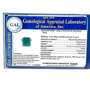 This Emerald and Diamond ring has been Certified, Inspected, and Appraised by Gemological Appraisal Laboratory