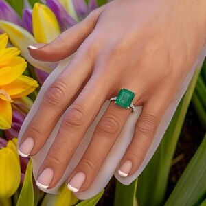 The emerald is set in a sleek, polished band and surrounded by a dazzling halo of sparkling diamonds, each one meticulously chosen for its clarity and brilliance.