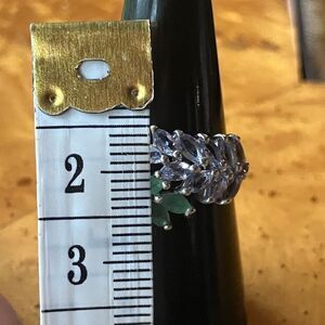 This beautiful ring features genuine, earth mined emerald and tanzanite. The stones are marquise cut and measure 4x2 mm. The total carat weight on the ring is 2.00. The ring is set in solid .925 sterling silver with a rhodium finish. The ring in the photos is the one you will receive, so please see photos for gemstone quality and measurements. Size 7.
