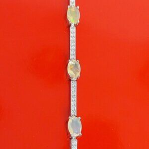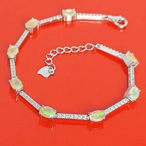 Natural Fire Opal Rainbow 6x4mm & Cz 925 Sterling Silver Bracelet 7"