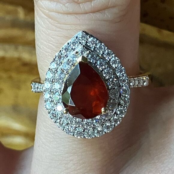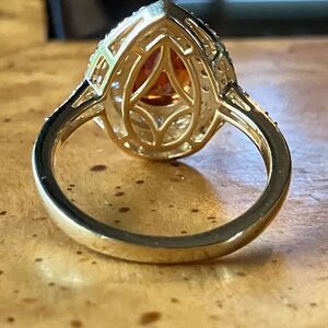 This beautiful ring features a completely natural, earth mined Hessonite garnet. The stone measures about 9x7mm and is a beautiful reddish orange color. The clear accent stones are Moissanite. Moissanites are a lab created diamond replacement that are extremely durable and sparkly. The ring is set in solid .925 sterling silver with an 18k yellow gold vermeil. The ring in the photos is the actual one you will receive, so please see photos for quality and measurements. Size 7.25.