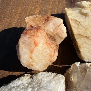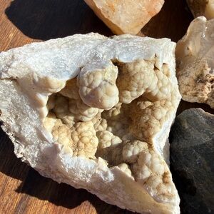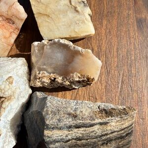 Set of five unique natural stones. Perfect for decor or collection. Includes agate, geode, quartz, jasper, and feldspar.