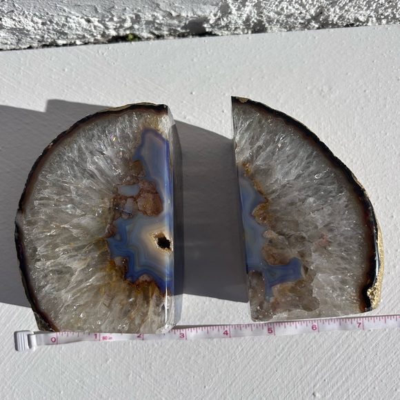 Beautiful natural geode bookends with stunning crystal formations. Features shades of blue, brown, and gray.